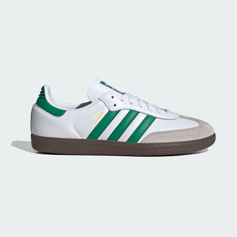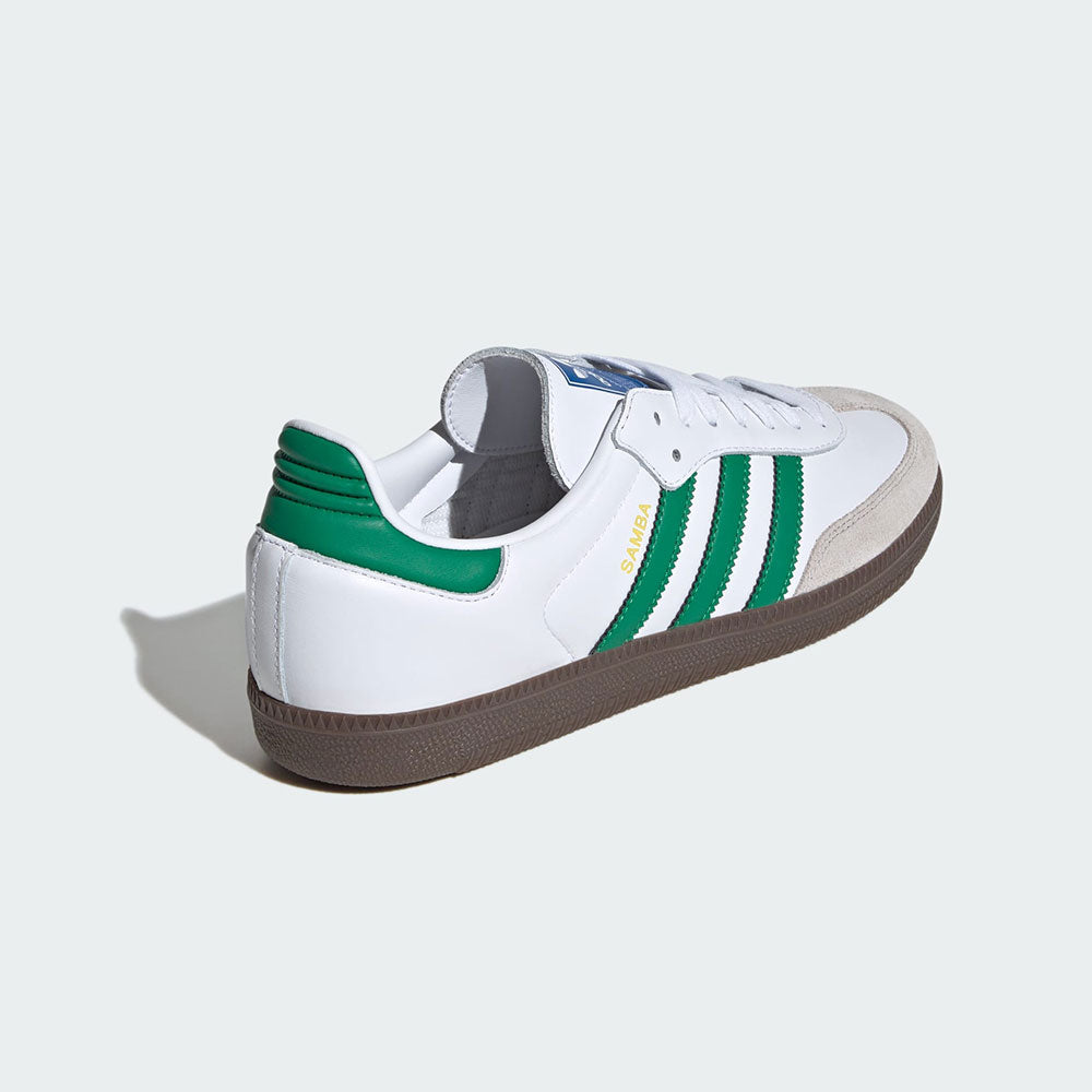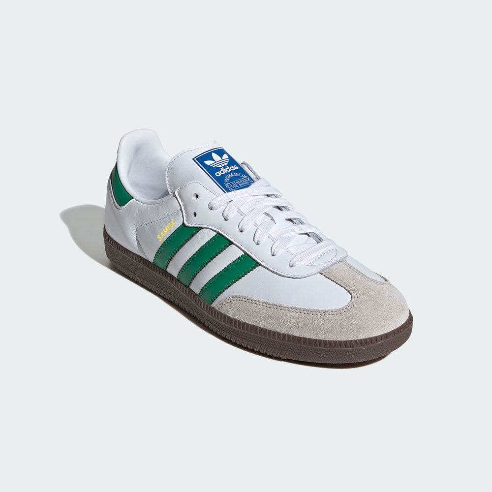 The adidas Samba “Mexico” is a colorway of the retro indoor soccer shoe inspired by Mexico’s home soccer jerseys. A clean look for the ultra popular Samba, the “Mexico” celebrates Mexico’s national soccer club and features a white leather design with green leather Three Stripes branding on the sides. Gold “Samba” detailing appears next to the classic logo. Mexico’s team logo is printed on the white leather tongue, giving the shoe a unique look. A gum rubber sole completes the design.